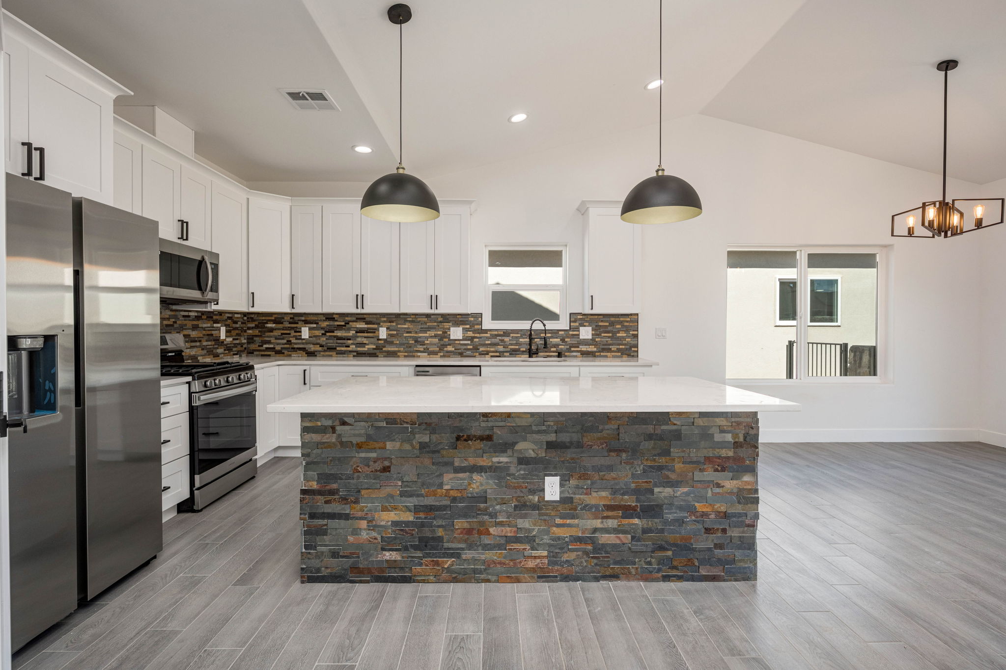 A bright and stylish 3 bedroom home designed for comfortable everyday living. The vaulted ceiling creates an airy feel throughout the open living, dining, and kitchen areas, centered by a striking stone wrapped island and crisp white cabinetry. A spacious primary suite, well sized backyard, and thoughtful details like pendant lighting and a wide entry hall add both function and charm. With its clean design and inviting layout, this home delivers standout value from front to back.